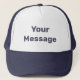 You can create your own message in navy blue text on this navy blue and white trucker hat.
