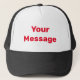 You can create your own message in bright red text on this black and white trucker hat.