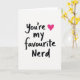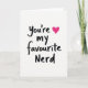 This card features the message “You’re my favourite Nerd” in black, casual hand-lettered writing centered on a plain white background. Right after the word “You’re,” there’s a single fuchsia-pink heart that adds a sweet pop of color ❤️. The letters look slightly uneven in a natural way, like someone wrote it with a pen, which makes it feel more real and close. With so much white space around the words, your eyes go straight to the message and the heart. Calling someone your “favourite Nerd” comes across as affectionate and a little teasing, like an inside joke between two people who really get each other 🥰. It’s a simple design, but it feels meaningful because it celebrates someone’s quirks instead of trying to be overly serious. This is a nice choice for a partner or close friend when you want to say “I like you exactly as you are.” Hope it helps you share Valentine’s Day feelings in a warm, easy way.