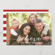 Send out your Christmas greetings to your friends and family using this beautifully hand-lettered, simple holiday photo card with the word "Believe" written in a white script font overlay. Design by ELKE CLARKE© FOR MONOGRAM GALLERY. Replace sample photo with your own. Red and white striped background on back of card. Other colours available in store at www.zazzle.com/monogramgallery
