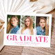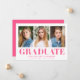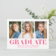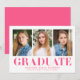 Celebrate your graduate's milestone with these minimalist graduation announcements, showcasing three of their best photos and bold hot pink "Graduate" lettering. This modern and vibrant design offers a fun and stylish way to announce their achievement. Personalize the announcement by adding the graduate's name, school name, and graduation year for a truly unique touch. Perfect for both high school and college graduates, this multi-photo design is an eye-catching and memorable way to share their success with loved ones.
