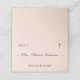 Front design features a champagne-pink background to guest's name which is displayed in an elegant, silver-coloured font. A delicate flourish is pictured on either side of name. Top left corner features table number in same elegant font. A silver-coloured cross is displayed in top right corner. First names of couple are displayed below in a clear print.