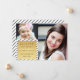 Two photo design - perfect for a baby picture and recent photo! Simple white background with diagonal black stripes. Text is dark grey on a gold framed rectangle. Stylish, modern, classy - perfect! Product does not contain actual gold foil.
