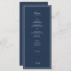 Nautical Blue background for simple, yet elegant typography based design. Couple's monogram footer. White on dark navy blue. Reverses to solid blue colour. Menu card has varied fonts and single line embellishment under "Menu". A very Nautical look in both colour and typography.