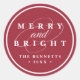 Our personalized holiday seals add an elegant and festive touch to all your Christmas cards and invitations. Design features "Merry and Bright" in a chic mix of block and calligraphy script typefaces in crisp white on a festive cranberry red background. Personalize with your family name and the year beneath.
