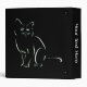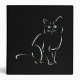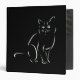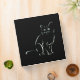 A simple white sketch, line art, of a sitting cat on black. A black and white cat design with utterly plain elegance.