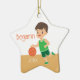 Personalize this cute basketball ornament for the sport-loving boy in your life! This ornament features a brunette boy dribbling a basketball on a basketball court. Also available in other colours for extra customization.
