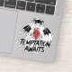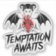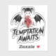 Unleash dark elegance with this gothic design featuring a seductive demon with curled horns, bat-like wings, and a burning heart in their claws. Accentuated by the phrase "Temptation Awaits" in bold, jagged black font, this design is perfect for fans of edgy, supernatural esthetics.