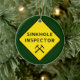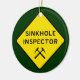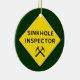 Sinkhole Inspector - dark green ornament with yellow and black diamond warning sign style design and crossed rock hammers graphic.