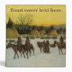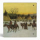 Sioux Camp at Wounded Knee (1904) by John Hauser is a vintage fine art American West painting. Daily life scene at a Sioux tribal village with Native American Indians riding horses in the snow during winter. A beautiful sunrise or sunset is in the distance past the mountains.