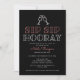 This stylish bridal shower invitation features pink and white text on a black background. It has an illustration of two champagne glasses toasting above the words "sip sip hooray" at the top with plenty of room for all of the bridal shower details below.