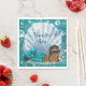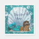 Sirène sous les serviettes en papier de mer avec adorable bébé sirène afro-américain dans une jolie coquille de palourde sur un bel arrière - plan bleu turquoise. Vous pouvez ajouter du texte dans le style de police et la couleur de votre choix pour personnaliser votre événement. Il s'agit d'un design imprimé sans vrais bijoux, parties scintillant, etc.
