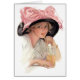 Jeune femme sirotant un soda tout en portant un casquette noir avec un grand arc rose. Une magnifique scène vintage.