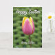 This greeting card features a close-up photo of a single tulip centered in the frame, like a small gift offered with sisterly affection 🌷. The outer petals are a deep fuchsia pink, shifting into lemon yellow on the inner folds and along the softly feathered edges. A slender, deep green stem rises from the bottom, grounding the flower while the bloom leans forward with a gentle, welcoming posture. Across the top, the words “Happy Easter” appear in white, flowing lettering that stands out against the green background. Near the bottom, “to my Sister” is placed in matching white lettering, spaced low and centered so it feels like a quiet note meant just for her 🐰. Behind the tulip, the background fades into a soft green blur that suggests a woven or lattice pattern without pulling attention away from the flower. Natural light gives the petals a tender glow, and the faint lattice texture sits softly in the background.