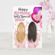 A beautiful illustration of a woman with long blonde hair holding a bunch of vibrant pink, purple and fuchsia coloured balloons sitting with her arm around her sister who has long dark coloured hair. They are surrounded by soft pink confetti ribbons and glitter. The words, happy birthday to a very special sister (which may be changed to daughter, granddaughter, niece, godchild etc) appears on a white background. The inside has a lovely tender message which should be customized to suit whatever family relation you have inserted on the front.