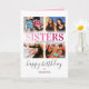 Sibling sister birthday card featuring a 4 photo collage, the word "sisters" in a girly pink gradient font, a personalized quote, a cute heart, and name.