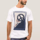 Sisyphus pushing a stone peace symbol up the mountain. Vintage style original drawing, with decorative and text border.