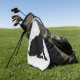 This golf towel is white with black polka dots and the side profile of a sitting rabbit in black silhouette.