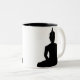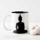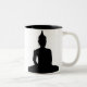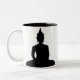 A solid and simple picture of sitting Buddha. Buddha is in meditative state with his legs crossed, sitting. Image is made as silhouette, coloured only in black, with sharp edges.
