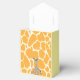 A cute design featuring a sitting giraffe on a orange giraffe pattern background.