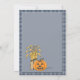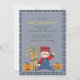 An adorable scarecrow sitting next to a bale of hay and two jack-o-lanterns is wearing a smile and waving hello. It is framed with a plaid pattern which is fully repeated on the back. This versatile invitation is well-suited for children's birthday celebrations, barn parties, fall baby showers, Thanksgiving and more.