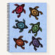 This spiral notebook is light blue with a group of six abstract turtles with brightly coloured patterned shells in blue, red, yellow, green, purple, and orange.