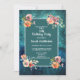 Teal and navy blue grunge-textured sixteenth birthday party invitation with delicate pink and peach floral. The back of this invitation is a diagonal teal and white stripe design.