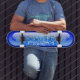 SKATE text floating in Blue Flames, with Blue Flames from the trucks as well. The Font SKATE is done with is called Flame. Some Blue Star Busts on the Flips. Awesome unisex design. For the grind, or special wall art. Functional Art. Trendy modern Prop for movie sets, house home, staging.