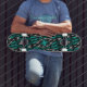 This quality made skateboard is shown with a abstract art pattern print in colours of black, grey and teal.