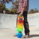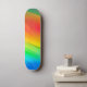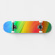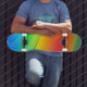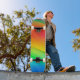 This quality made skateboard is shown with a abstract art pattern print in a rainbow effect of colours blue, green, orange and red.