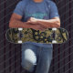 Add an artistic touch to game time with this skateboard, which features a black and gold artistic floral-inspired abstract pattern.