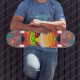 Planche à roulettes Deluxe Sizzle Burger pixel art avec food truck et élément grill.