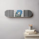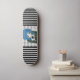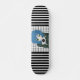 Un skateboard cool avec des rayures noir & blanc audacieuses et modernes, un motif cool en vichy et un personnage de bande dessinée avec une tablette dans les mains avec un autocollant de symbole de paix dessus.
