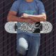 Planche à roulettes dépeignant la géométrie sacrée accompagnée du graffiti de la dernière page de "mon premier livre de coloriage de graffiti."