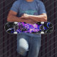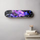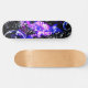 une oeuvre décorative dans l'espace avec une nébuleuse dans l'espace violet avec des planètes et des lunes émergeant de l'espace noir sur un skateboard.