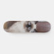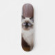 La patineta tiene un diseño específico, representando la imagen de un gato peludo de la raza Ragdoll. Un Ragdoll es una raza de gato conocida por su pelaje suave y largo, así como por su temperamento calmado y sociable. En este caso, la patineta presenta un diseño que incorpora la apariencia distintiva de un gato Ragdoll, con detalles que resaltan su pelaje y sus características faciales. Este enfoque estilizado y temático le otorga a la patineta un toque único y personalizado, fusionando el mundo de los deportes extremos con la estética de un gato Ragdoll.