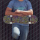 Gelli print stencilled abstract art in greens, purple and gold. This design was created using the gelli plate technique. Artwork and photography by Sandra Foster Designs ©.