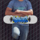 Skateboard Graffiti bleu sur un mur de briques