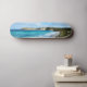 Image d'une longue vue d'eaux de mer de couleur aqua se brisant sur du sable blanc, avec de hautes falaises et une végétation luxuriante sur la plage par une journée ensoleillée et nuageuse