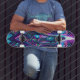 "Faites le rythme du futur avec le "Neon Groove : Cyber DJ Skateboard Deck". Cette terrasse présente un DJ androïde élégant, aglow avec circuit de néon, filant des pistes sur une table à platine high-tech. Dans un club futuriste baigné de lumières laser et d'étalages holographiques, la scène est animée par l'énergie des amateurs de club-ball. Les violets de néon, les bleus électriques et les verts vibrants capturent l'atmosphère électrisante du club.