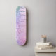 Planche à roulettes avec des couleurs arc-en-ciel unicorne de fausse parties scintillant qui coule contre un arrière - plan rose.