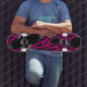 Ce skateboard de qualité est présenté avec un imprimé motif d'art abstrait en couleurs noir, gris et rose. Acheter tel quel ou customiser cet objet à votre goût. Image stock vecteezy.com