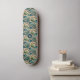 This tropical theme vintage look skateboard will remind you of the beach, surf, and sand. Swirls of Polynesian waves reveal tropical blue and geen jewel tones of the South Pacific and palm trees in a retro style, remniscent of beach-inspired ethnic art or tattoos. Your initial appears in a teal green circle, with a double border in a sandy tan color.