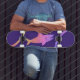 Un pont de skateboard avec un requin arc-en-ciel sur un arrière - plan violet. Le requin et les lignes courbes ont un aspect de parties scintillant arc-en-ciel. (La parties scintillant est une image simulée et non une parties scintillant réelle de papier) Parties scintillant de requin arc-en-ciel Purple Skateboard Conception de jour férié | ©Melissa Patton - Artiste/Illustrateur