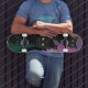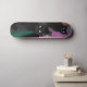 Sammy le chat noir est un modèle amusant pour skateboard avec un arrière - plan brillant dans les tons jaune, vert, noir et rose. Photographie originale et design par Anura Design Studio 2009.