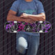 Impression vintage tropicale inspirée des chemises aloha des années soixante et soixante-dix. Un mélange coloré de rose et de violet passe à travers les fleurs d'hibiscus du haut au bas de la planche sur un arrière - plan de noir, gris et blanc. Personnalisable à un large assortiment de formes et de tailles de planches. Ces dessins sont présentés dans plusieurs coloris.