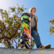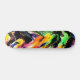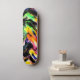 Ce skateboard unique est doté d'un motif abstrait dans plusieurs couleurs vives et noir.