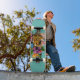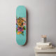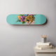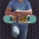 une oeuvre décorative d'un tigre redoutable émergeant de fleurs colorées et d'étoiles noires sur un skateboard.