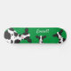Un jeu de skateboard de nom personnalisé avec des vaches illustrées, noires et blanches, sur un arrière - plan vert. Customisez simplement le nom, ajoutez-le à votre panier et profitez-en. Vache Vert Nom animal Skate Jour férié Design | ©Melissa Patton Artiste/Illustrateur