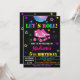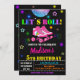 Rolling neon colours theme birthday invitation for a girl birthday featuring disco ball, pair of girly skates and some stars around.